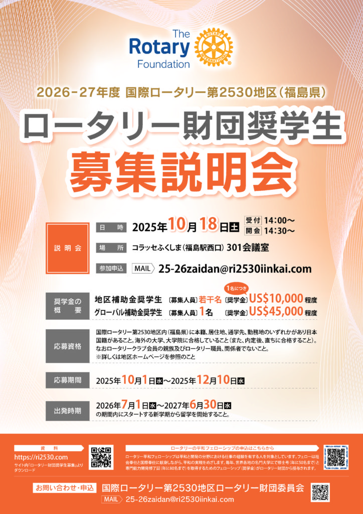 国際ロータリー第2530地区では、2026-27年度のロータリー財団 地区補助金奨学生・グローバル補助金奨学生を募集いたします。応募に関してはそれぞれ条件がございますので、要項をダウンロードしてご確認ください。また、説明会を行いますので希望される方はぜひご参加ください。